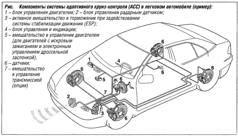 Основными компонентами системы являются устройства (радары, лазерные дальномеры, стереокамеры) для измерения дистанции для преграды и электронный блок, который принимает и обрабатывает информацию от измерительных устройств и взаимодействует с блоками управления двигателем и тормозами.