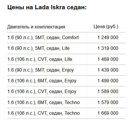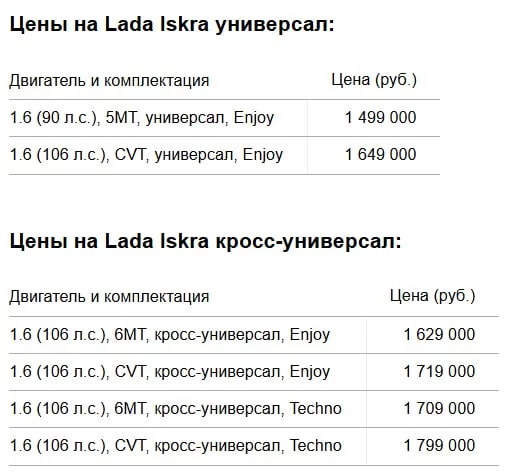 Новая модель выходит в продажу сразу в трех типах кузова — седан, универсал и универсал SWCross. Стартовая цена LADA Iskrа составит от 1 249 000 рублей (седан в комплектации Comfort с двигателем 1,6 л (90.л.с) и механической трансмиссией). При этом, с самого начала продаж на LADA Iskra доступны скидки до 20% в рамках государственных программ субсидированного кредитования для отдельных категорий покупателей, включая многодетные семьи, работников образовательных и медицинских организаций и участников СВО.