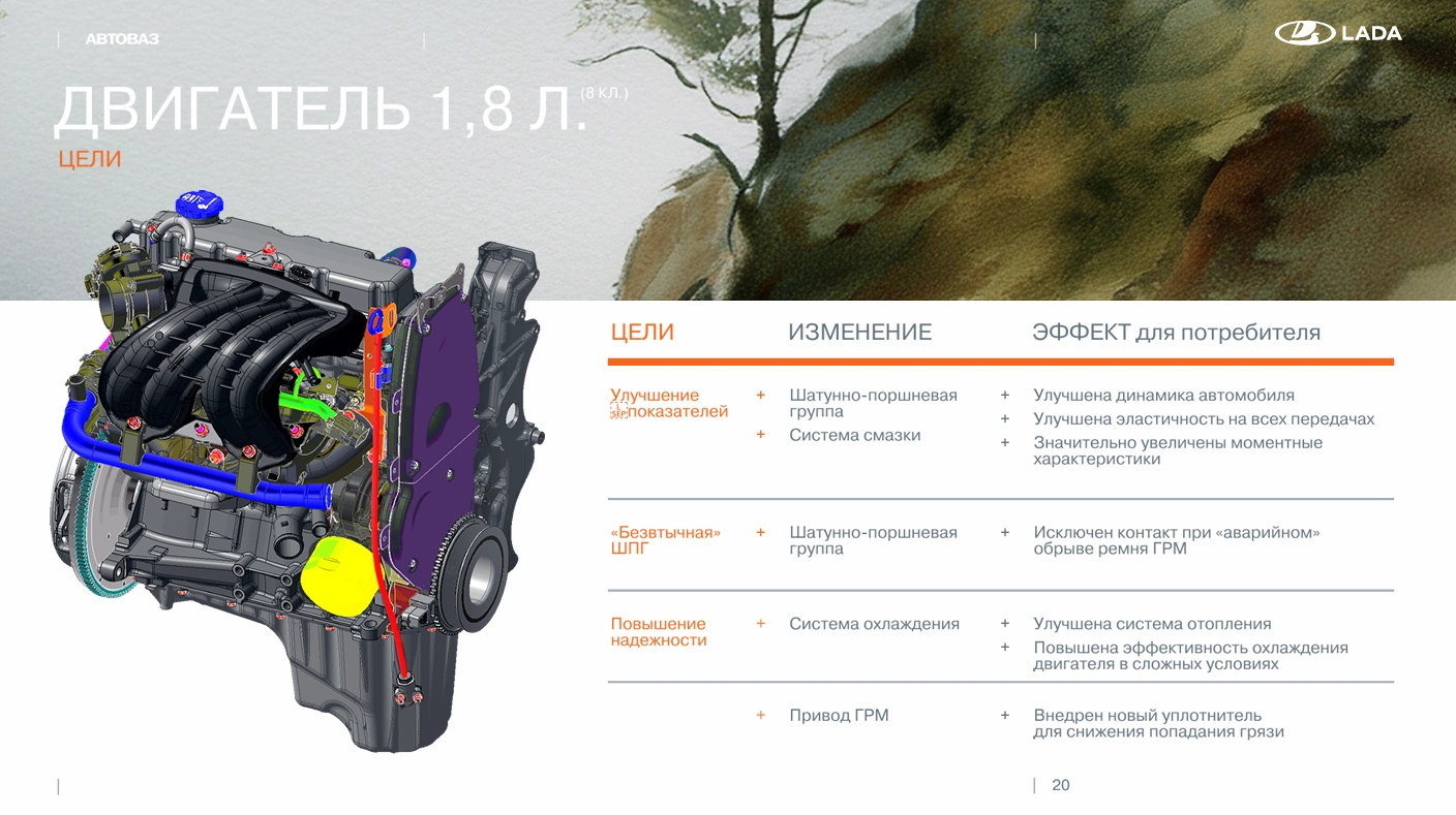 Также о том, что новый двигатель 1.8л имеет «безвтычную» шатунно-поршневую группу, которая исключает контакт при «аварийном» обрыве ремня ГРМ, рассказывается в презентации завода.