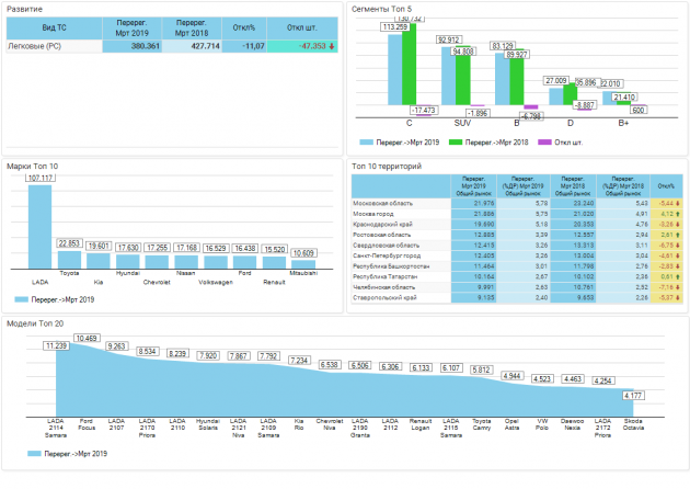 В марте 2019 года объем рынка легковых автомобилей с пробегом в России составил 430,9 тыс. единиц, что на 0,2% меньше, чем в марте 2018 года. На долю автомобилей LADA пришлось 25% от общего объема. В количественном выражении это составляет 108 тыс. штук, что на 4,7% ниже показателя годичной давности.