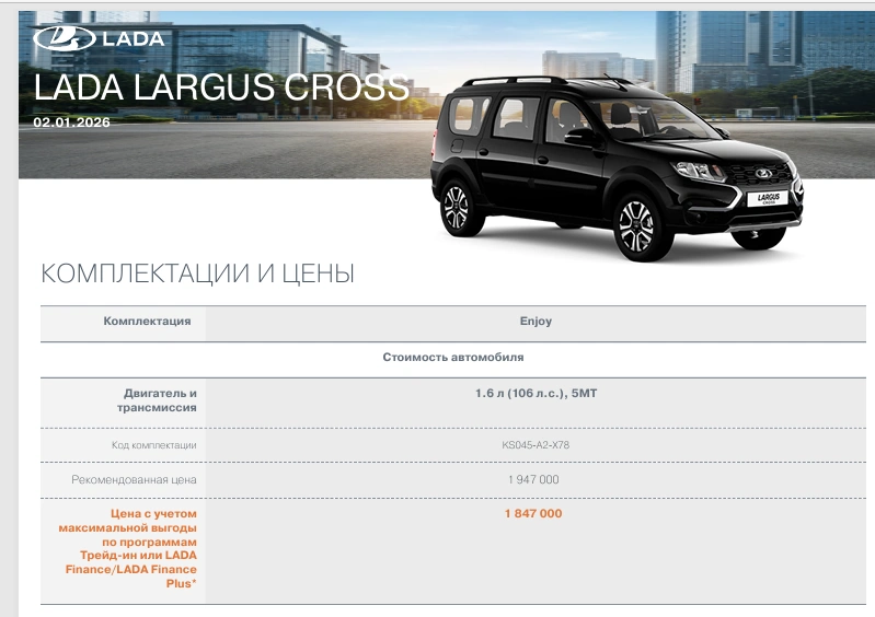 | LADA Largus FL Cross (макс) | 2 020 000.00 ₽ | 1 947 000.00 ₽ | -73 | -3.61 |