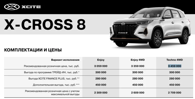 Стоит отметить, что в настоящий момент действуют специальные предложения (программа ТРЕЙД-ИН, FINANCE PLUS, и дополнительная выгода), которые позволяют получить выгоду при покупке XCITE от 730 000 до 1 030 000 рублей для X-CROSS 7 и X-CROSS 8 соответственно.