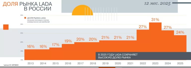 Продажи автомобилей, реализованных через официальную дилерскую сеть LADA в России, составили 351 390 автомобилей (LADA и XCITE). Этот показатель практически сравнялся с результатом 2023 года. Рыночная доля компании составила 25%.