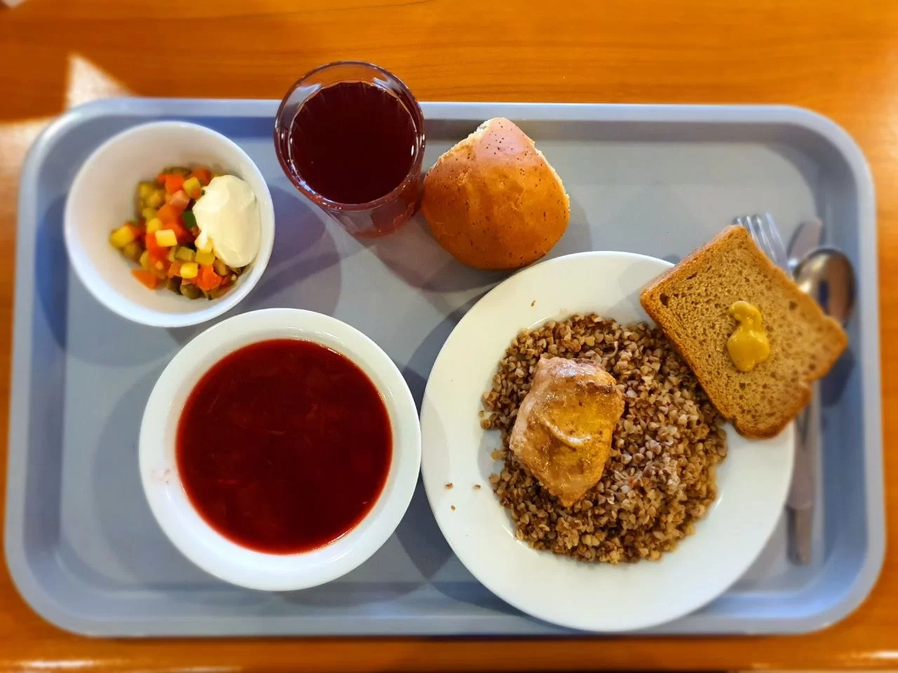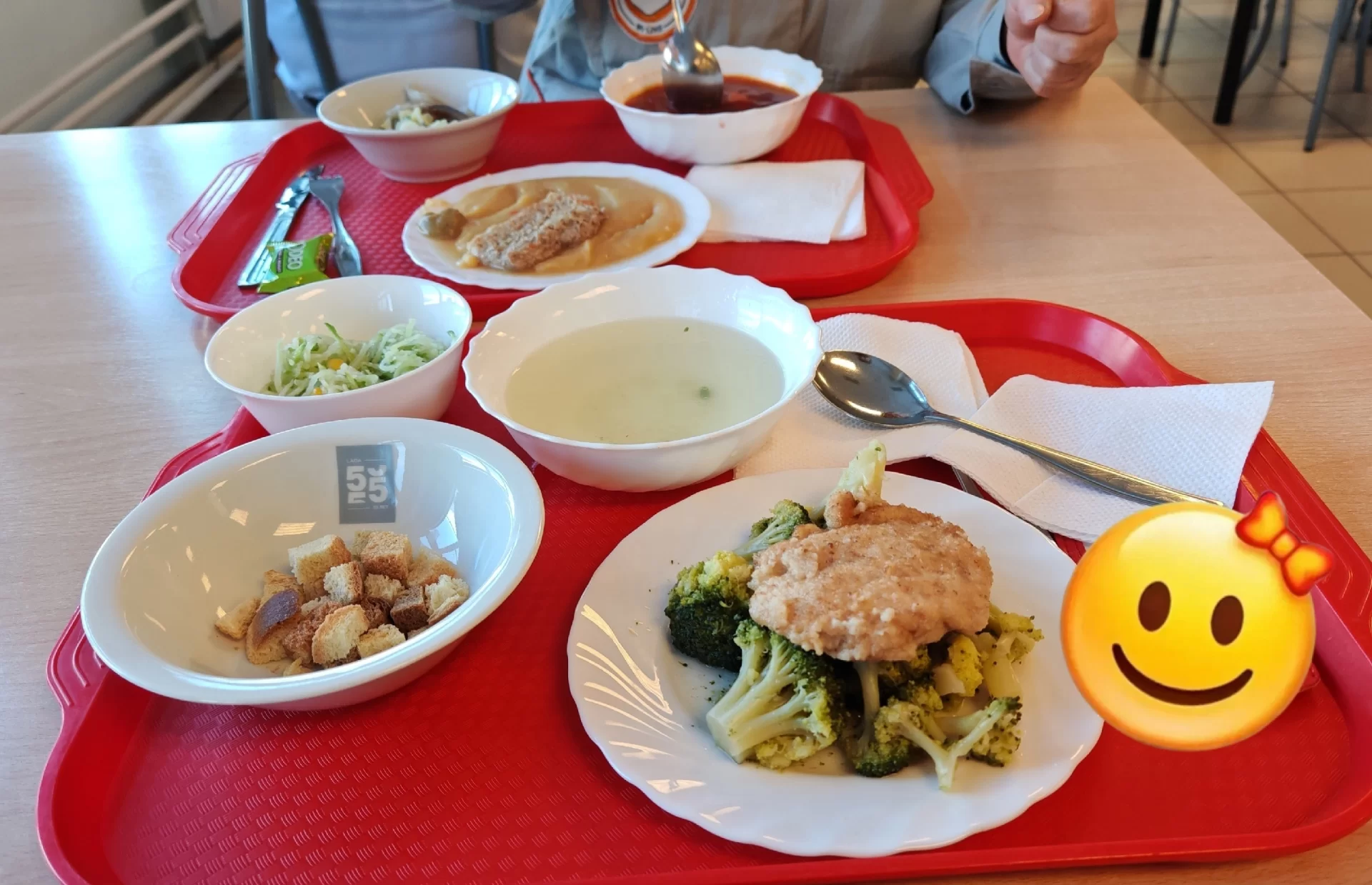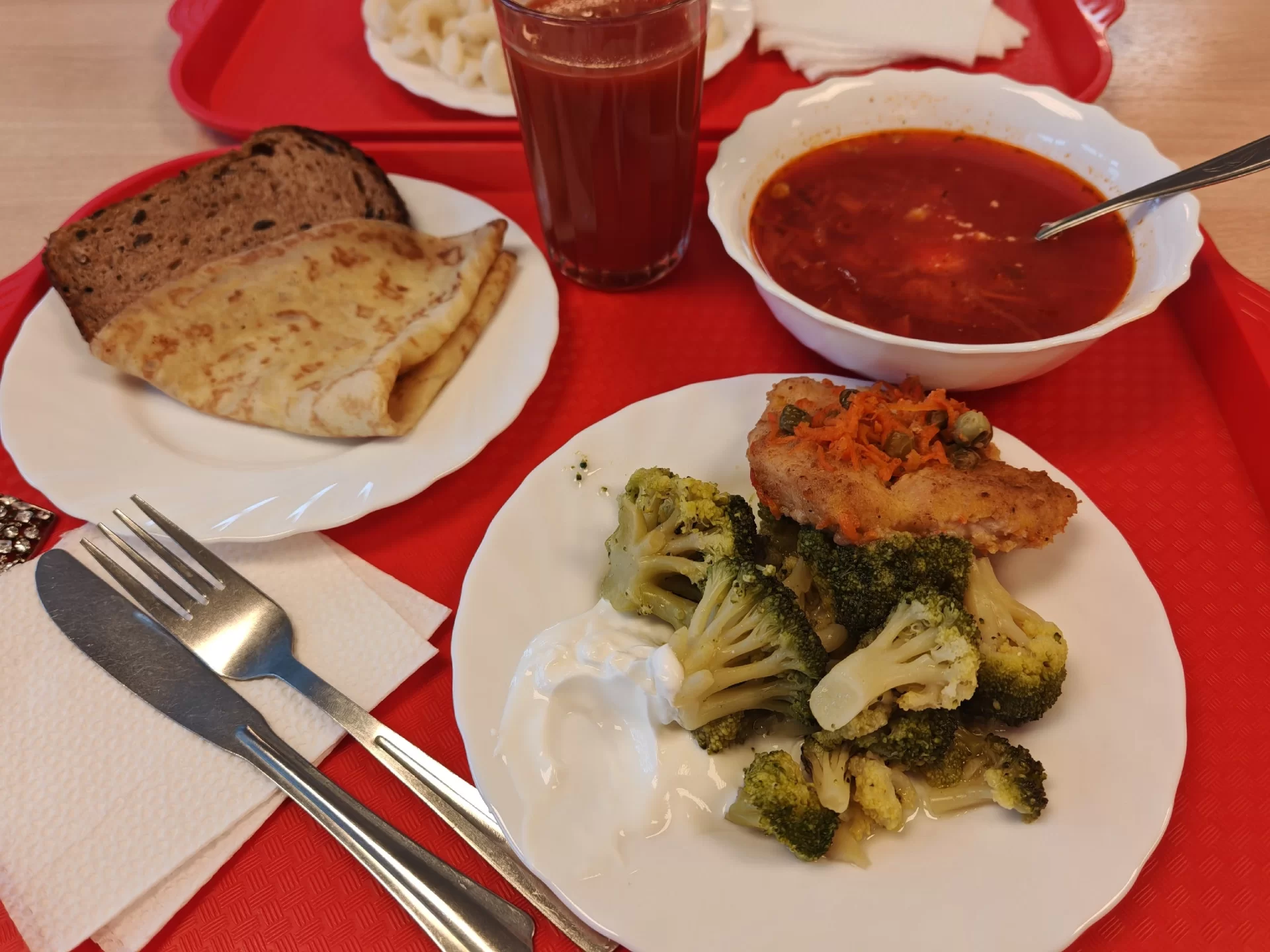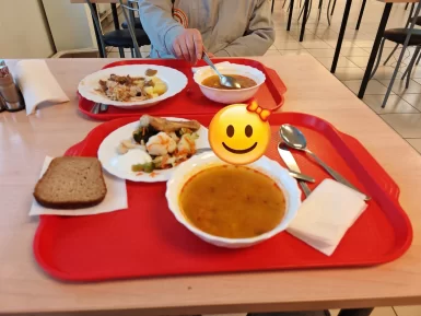 В меню — первые и вторые блюда из мяса птицы, свинины, говядины, рыбы. Также обязательно учитывается сезонность. Ассортимент блюд включает в себя овощи, характерные для данного сезона. А во время Великого Поста в меню свободной раздачи вводятся постные блюда.