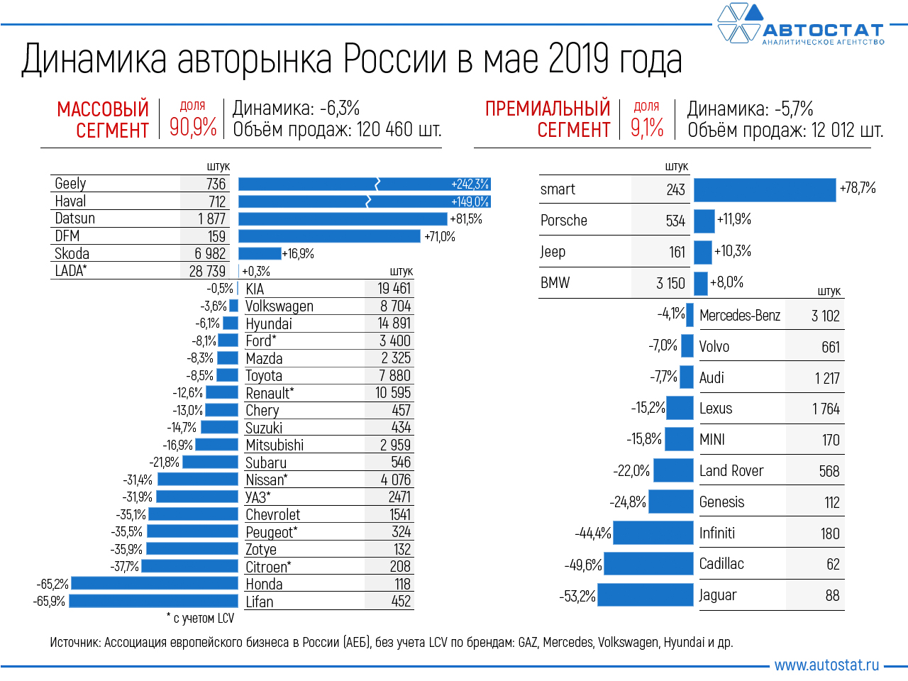 Ассоциация европейского бизнеса (АЕБ) опубликовала результаты продаж автомобилей в РФ за май 2019 года. В этом месяце года в России было продано 137 624 легковых автомобилей (LADA - 27 739 шт.), что на 6,7% меньше (LADA - 0%), чем в мае прошлого года. Это максимальное падение рынка за 2 года. Самым популярным автомобилем второй месяц подряд становится модель Lada Granta.