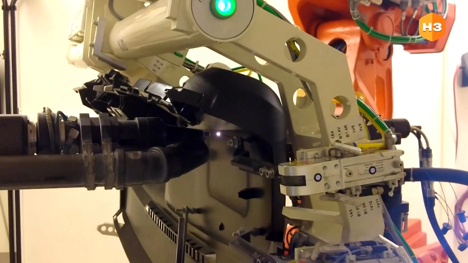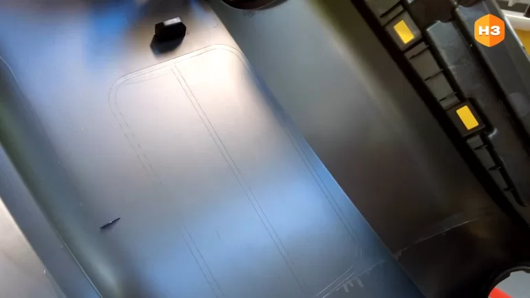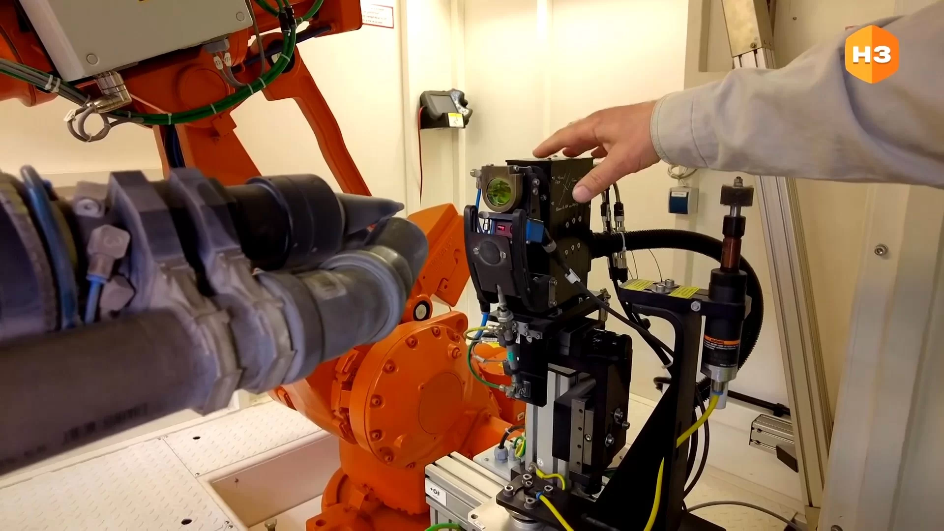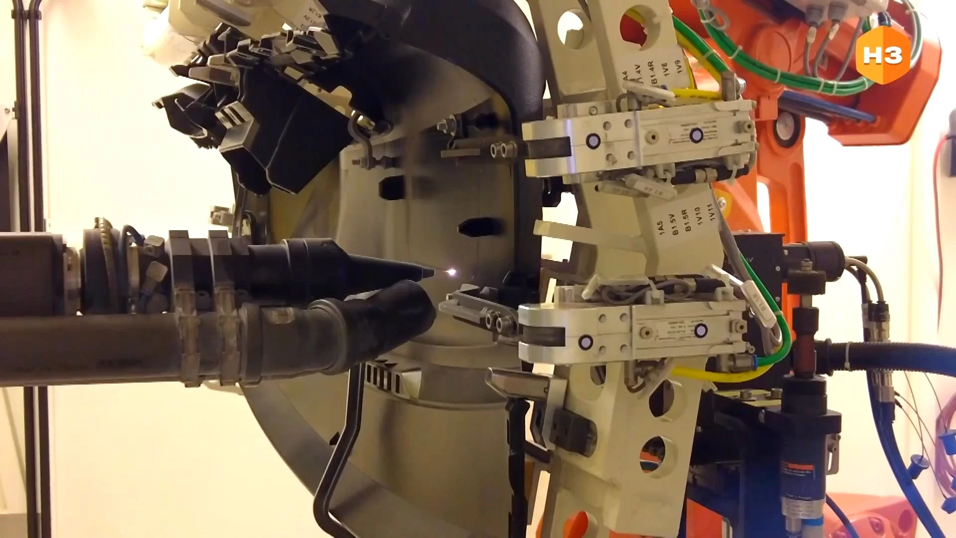 Он состоит из 6-осевого робота с оснасткой под крышку панели грузоподъемностью 60 килограммов. Из станции лазерные резки, которые благодаря частоте импульса в 5 тысяч в секунду, производят высокоточные не отверстия, а углубления, которые не доходят до внешней стороны изделия буквально на 2 десятых миллиметра.