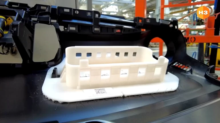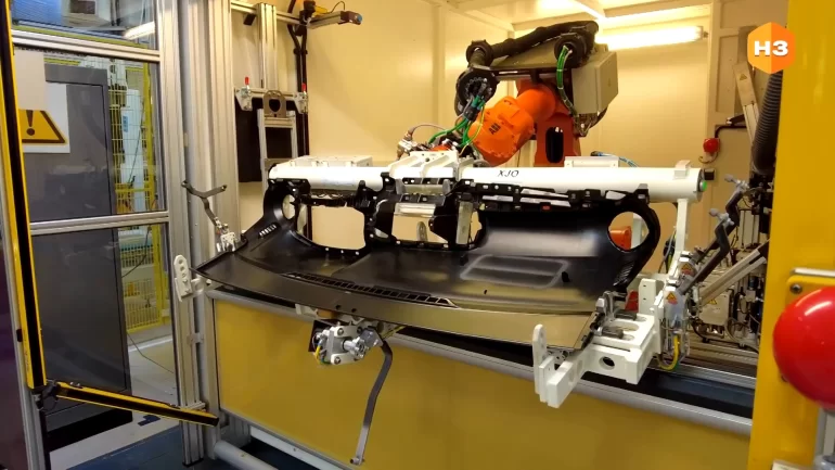 На АВТОВАЗе в производстве пластмассовых изделий показали робототехнический комплекс, с помощью которого выполняется перфорация панели приборов для подушки безопасности Lada Iskra.