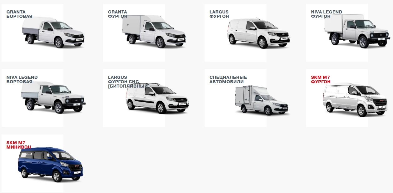 Ассортимент «Лада Бизнес» включает: SKM, фургоны Lada Largus, метановые версии Largus и Vesta, переделки Granta и Niva Legend, а также спецтехнику от «Промтех».
