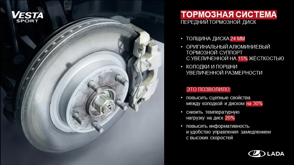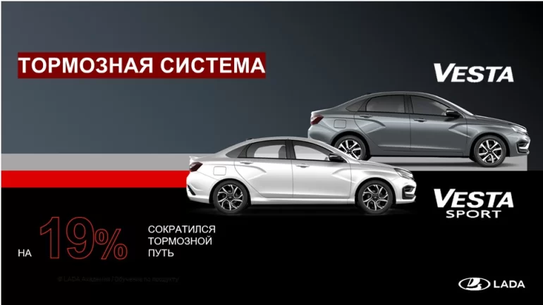 Новое поколение Lada Vesta Sport получила не только форсированный двигатель, но и модернизированные тормоза. Доработки конструкции позволили сократить тормозной путь на 19%. Сайт Лада.Онлайн ознакомился с презентацией завода.