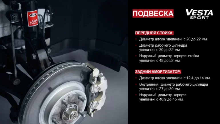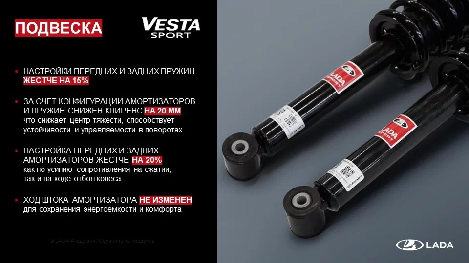 Специальные настройки шасси Lada Vesta Sport позволили создать спортивный характер автомобиля. Острая управляемость сочетается с плавностью хода, формируя впечатление крепко сбитого, надежного автомобиля, который предназначен для динамичного движения по асфальту и дорогам любого качества. На заводе в деталях рассказали про доработки подвески спортивной Весты, сайт Лада.Онлайн ознакомился с презентацией.