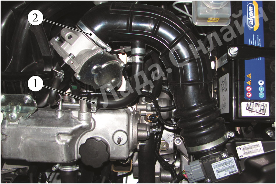 Ослабить хомут - 2 (рисунок 1) крепления шланга впускной трубы к дроссельному патрубку, ослабить хомут - 1 крепления верхнего шланга вытяжной вентиляции картера к патрубку крышки головки цилиндров, отсоединить шланги и отвести их в сторону (отвертка крестообразная)