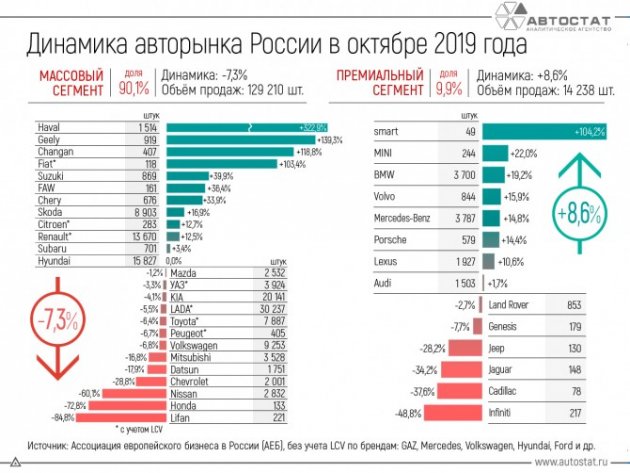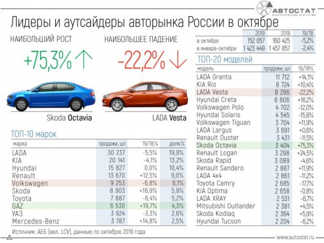 Ассоциация европейского бизнеса (АЕБ) опубликовала результаты продаж автомобилей в РФ за октябрь 2019 года. В этом месяце года в России было продано 152 057 легковых автомобилей (LADA - 30 237 шт.), что на 5,2% меньше (LADA - -6%), чем в октябре прошлого года. Самым популярным автомобилем седьмой месяц подряд становится модель Lada Granta.