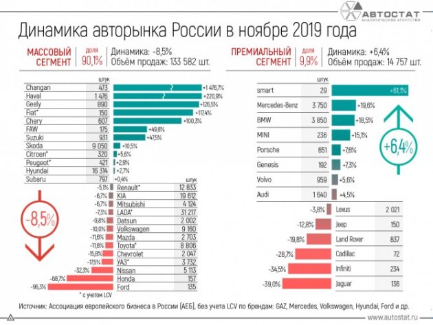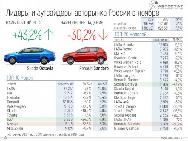 Ассоциация европейского бизнеса (АЕБ) опубликовала результаты продаж автомобилей в РФ за ноябрь 2019 года. В этом месяце года в России было продано 156 848 легковых автомобилей (LADA - 31 217 шт.), что на 6,4% меньше (LADA - -7%), чем в ноябре прошлого года. Самым популярным автомобилем восьмой месяц подряд становится модель Lada Granta.