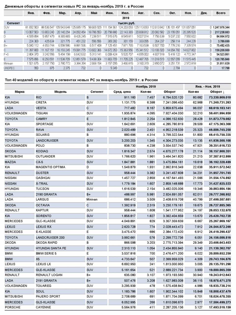 Рейтинг по выручке с продаж автомобилей за ноябрь 2019 года