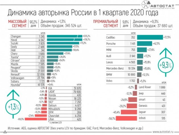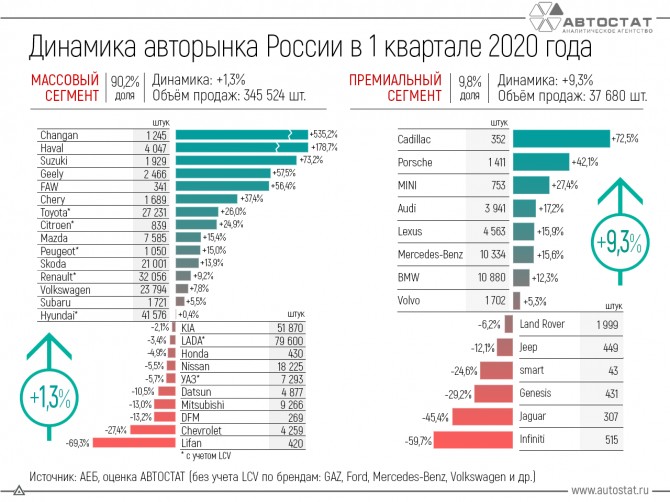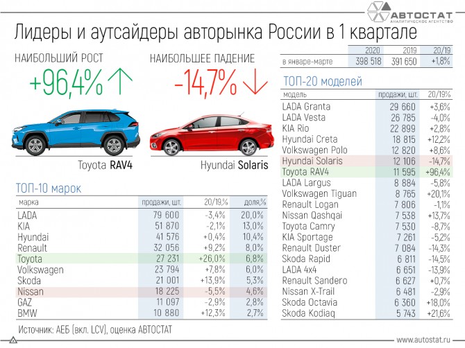 Ассоциация европейского бизнеса (АЕБ) опубликовала результаты продаж автомобилей в РФ за март 2020 года. В прошлом месяце в России было продано 162 321 легковых автомобилей (LADA - 32 808 шт.), что на 4% больше (LADA - -3%), чем в марте прошлого года. Самым популярным автомобилем двенадцатый месяц подряд становится Lada Granta. Lada Vesta - вторая по популярности.