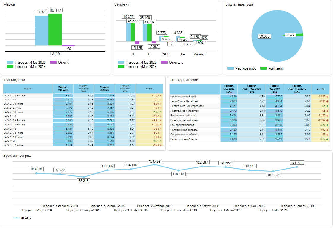 Аналитическое агентство «АВТОСТАТ» опубликовало статистику продаж автомобилей на вторичном рынке России. По итогам марта объем этого рынка составил 431,4 тыс. единиц (+0,1% по сравнению с аналогичным периодом 2019 года). Лидером по-прежнему остается отечественная марка LADA, на долю которой в прошлом месяце пришлось около четверти от общего объема (23,5%). В количественном выражении это составило 101,6 тыс. штук, что на 6% ниже результата годичной давности.