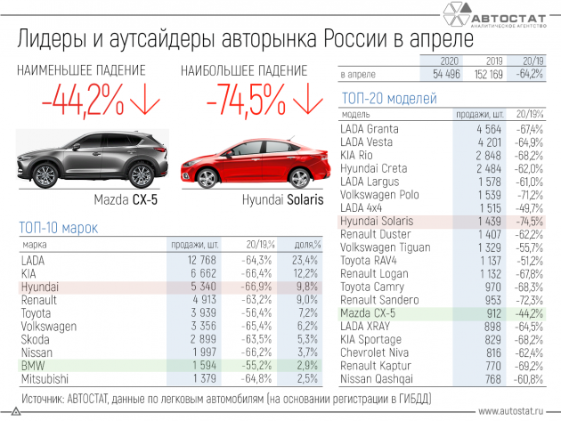 Ассоциация европейского бизнеса (АЕБ) опубликовала результаты продаж автомобилей в РФ за апрель 2020 года. В прошлом месяце в России было продано 38 922 легковых автомобилей (LADA - 9 369 шт.), что на 72,4% меньше (LADA - -71%), чем в апреле прошлого года. Самым популярным автомобилем 13-ый месяц подряд становится Lada Granta. Lada Vesta - вторая по популярности.