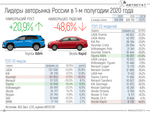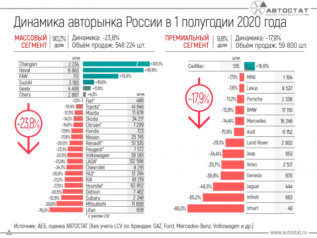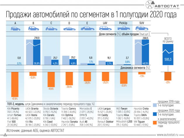 В 1 полугодии 2020 года продажи новых автомобилей и легких коммерческих автомобилей в России снизились на 23,3% по сравнению с аналогичным периодом 2019 года или на 192 791 проданную единицу меньше, и составили 635 959 автомобилей.