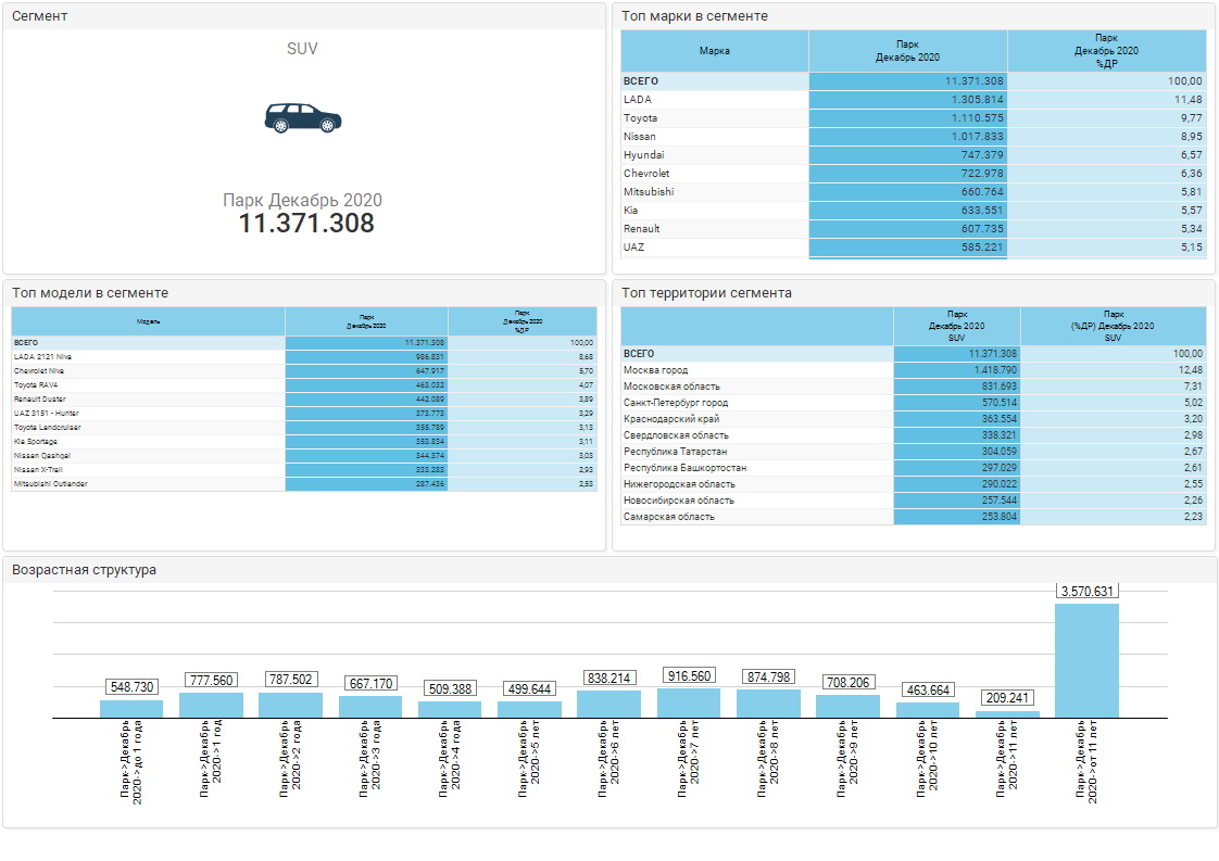 По состоянию на начало 2021 года России числятся 11,37 млн автомобилей, относящихся к сегменту SUV (кроссоверы и внедорожники), о чем сообщают в «Автостат Инфо». Самый распространенный в России SUV является Нива.