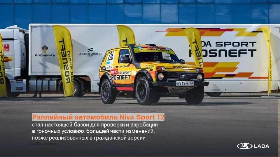 Lada Niva Sport воплотила в себе опыт побед LADA в ралли-рейдах на соревнованиях национального и международного уровней. Раллийный автомобиль Niva Sport T2 стал настоящей базой для проверки и апробации в гоночных условиях большей части изменений, позже реализованных в гражданской версии. Однако гражданская спортивная Нива не предназначена для гонок.