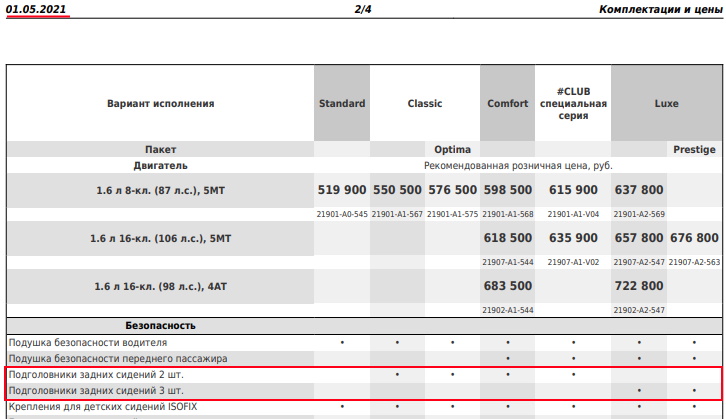У всего семейства Lada Granta в комплектации Luxe из оснащения исчезла опция «Подголовники задних сидений 3 шт.». Теперь у Гранты только сзади только два подголовника, начиная с версии исполнения Classic. Стоит отметить, что изменения не коснулись Lada Granta Drive Active, где по-прежнему используется три задних подголовника. Цена при этом не изменилась.