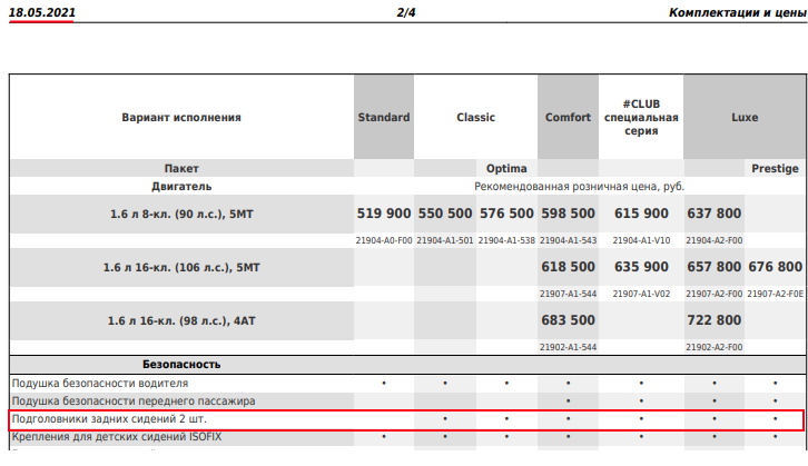 18 мая АВТОВАЗ изменил комплектации семейства Lada Granta, заменили 1.6 литровый 8-клапанный двигатель (с ВАЗ 11189 87 л.с. на ВАЗ 11182 90 л.с.). В ходе регулярного мониторинга цен и комплектаций автомобилей LADA сайту Лада.Онлайн удалось выяснить, что кроме этого из версии Luxe исключили третий задний подголовник.