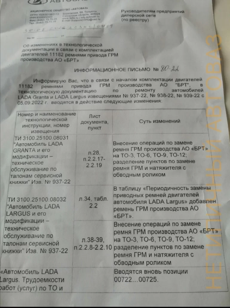 Из письма следует, что изготовитель отвел таким ремням ГРМ срок службы в 45 тысяч километров пробега. Соответственно и менять этот автокомпонент вместе с натяжителем и обводным роликом теперь необходимо при прохождении регламентных ТО-3, ТО-6, ТО-9 и ТО-12.