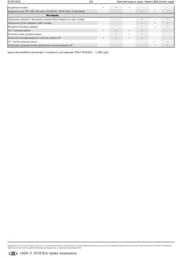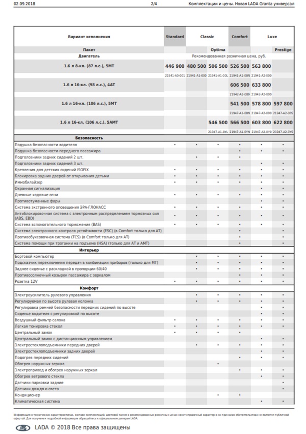Официальные продажи новой Гранты (Lada Granta FL) начались 1 сентября 2018 года. За день до этого события АВТОВАЗ раскрыл цены и комплектации автомобиля. Новинка предлагается в четырех различных вариантах исполнения и двумя пакетами дополнительных опций. На выбор три двигателя разной мощности и три типа трансмиссий.