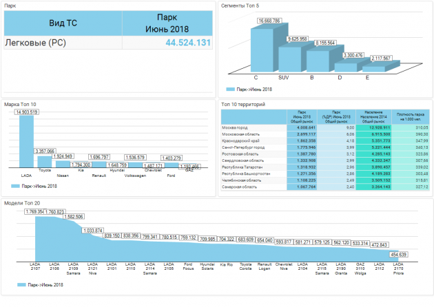 Согласно данным исследования «Автостат Инфо», в России насчитывается 44,52 млн автомобилей по состоянию на 1 июля 2018 года. По статистике на долю российских машин приходится 33,5%. Самая распространенная модель по-прежнему LADA 2107, а самой распространенной иномаркой остается Ford Focus.