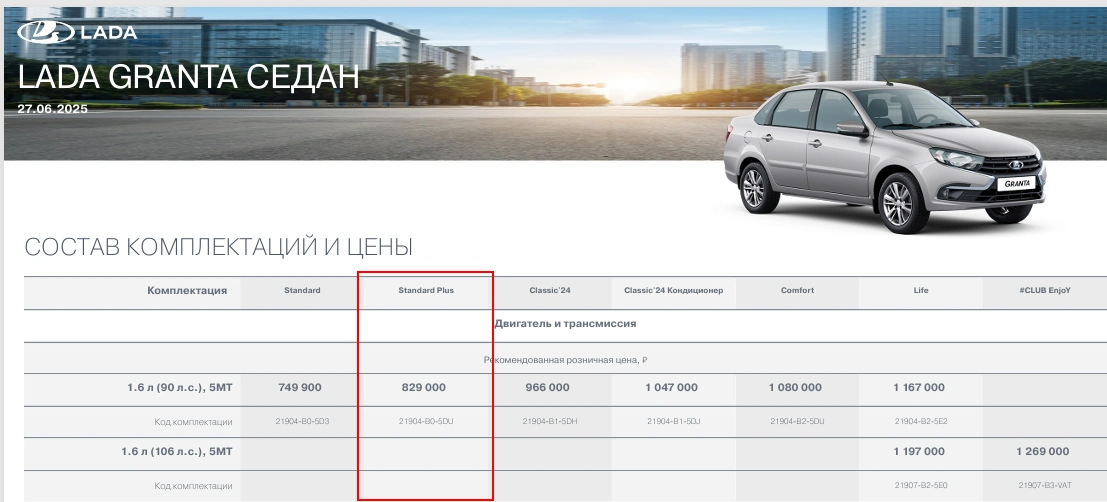 В конце июня в прайс-листах Lada Granta FL появилась новая версия исполнения седана Standard Plus (21904-B0-5DU). Эта комплектация дороже базовой на 79 100 рублей и имеет рекомендованную розничную цену (РРЦ) 829 000 рублей. Разбираемся, в чем ее отличия.