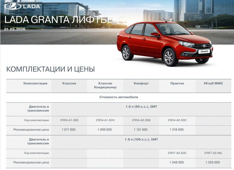 В ходе регулярного мониторинга цен и комплектаций автомобилей LADA сайту Лада.Онлайн удалось выяснить, что с марта 2026 года у лифтбека Lada Granta появилась новая базовая комплектация. Минимальная рекомендованная розничная цена этой модели стала дешевле на 81 тысячу рублей.
