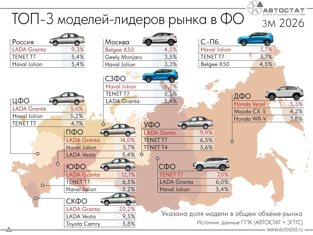 Эксперты агентства «АВТОСТАТ» определили тройку самых продаваемых новых легковых машин по итогам 1 квартала 2026 года в федеральных округах, а также в Москве и Санкт-Петербурге. Почти во всех округах РФ, за исключением Дальневосточного, в тройку лидеров вошла LADA Granta, которая первенствует и в целом по России.