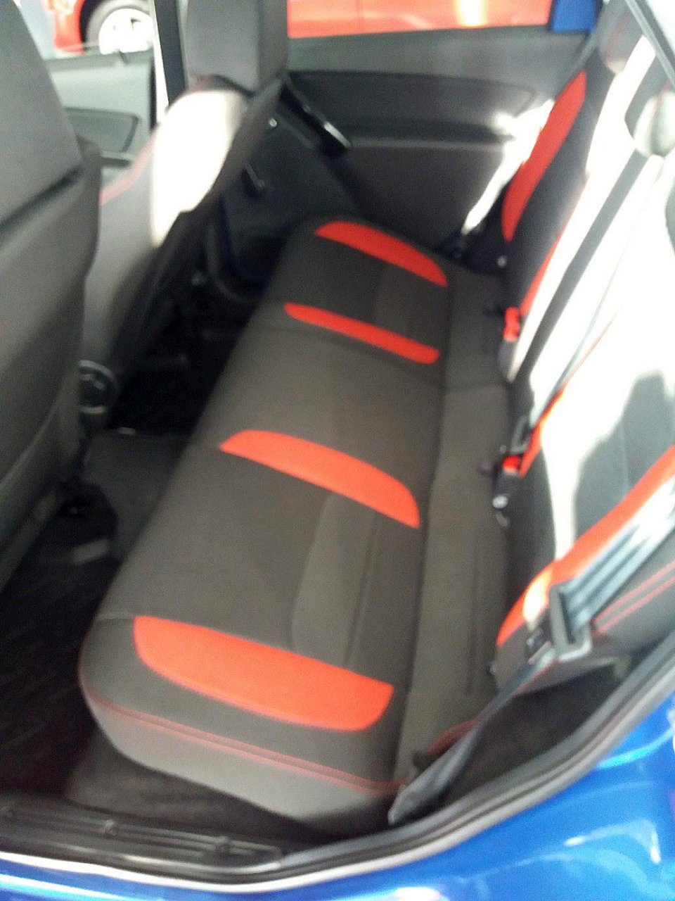 - Красной отстрочкой украшена кожаная оплетка руля, яркие вставки присутствуют в обивке сидений, а комбинация приборов получила красную подсветку.