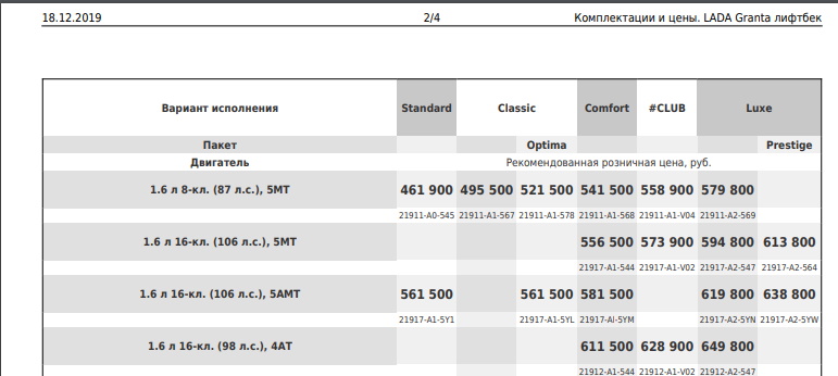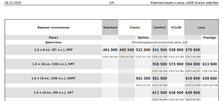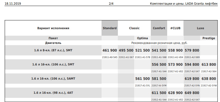 Новая комплектация Standard имеет код 21917-A1-5Y1. Эта версия автомобиля отличается наличием более мощного двигателя (1.6л., 16-кл., 106л.с.), который работает в паре с автоматизированной механической трансмиссией (АМТ или «робот»). Цена такого автомобиля 561 500 рублей. Стоимость новой комплектации на 100 тыс. рублей больше, чем лифтбек Standart с 8-клапанным двигателем мощностью 87 л.с. и МКПП.