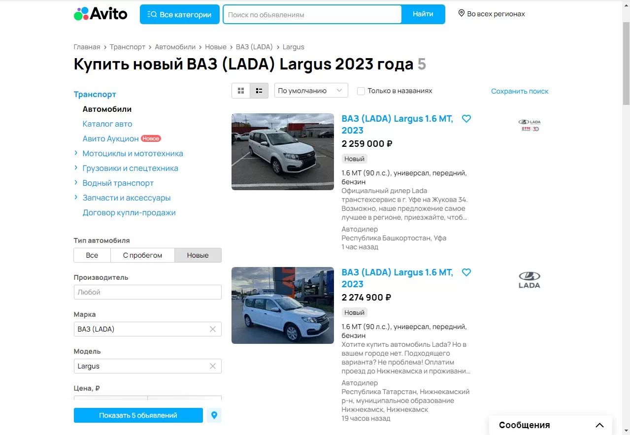 В Сеть попало коммерческое предложение дилерского центра LADA ООО "Форвард Авто" из г.Пермь. Автоцентр предлагает поставить автомобиль Лада Ларгус с двигателем мощностью 90 л.с. 2023 года выпуска за 2 500 000 рублей.
