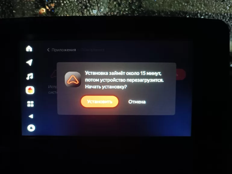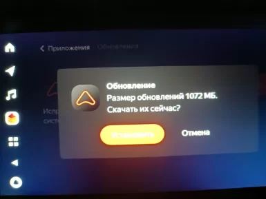 Обновление состоит из двух этапов: загрузка пакета и его установка. Загрузка проходит в фоновом режиме и не мешает работе системы. После загрузки пакета появится окно с предложением установить обновление. Во время установки обновления невозможно использовать систему. Установка требует перезагрузки системы и может занять до 15 минут. Не начинайте установку, если планируете выключить ММС в течение этого времени. Вы имеете возможность отложить установку на более подходящее время, для чего необходимо выбрать вариант «Позже». В этом случае повторного скачивания обновлений не потребуется. Окно с предложением установить обновление появится при нажатии на кнопку «Обновить» на экране обновления ПО.