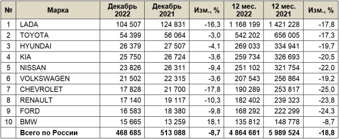 Эксперты агентства «АВТОСТАТ» обращают внимание на то, что 9 из 10 марок, вошедших в число лидеров по итогам декабря, демонстрируют отрицательную динамику.