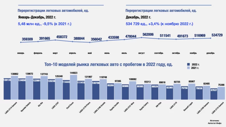«Автостат Инфо» подводит итоги 2022 года. Согласно данным статистики компании, за прошедший год в России было продано 5 482 792 легковых автомобилей с пробегом. Это на 9,5% меньше, чем было реализовано за весь 2021 год (6 055 327 ед.).