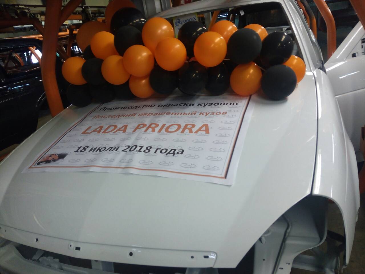 Обн.19.07.18: В социальных сетях появились фото последнего окрашенного кузова автомобиля «Лада Приора». Работники конвейера с теплотой провожают удачную модель АВТОВАЗа, кузов украшен воздушными шариками в корпоративных цветах, а на капоте расположилась табличка: «Производство окраски кузовов, Последний окрашенный кузов LADA PRIORA, 18 июля 2018 года».