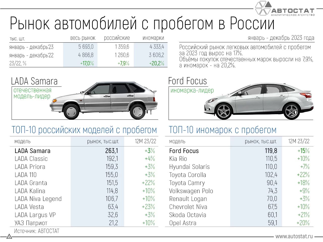 Согласно данным агентства «АВТОСТАТ», за весь прошлый год в России было куплено 5,69 млн подержанных легковых автомобилей. Это на 17% больше, чем в 2022 году. При этом объем вторичного рынка машин отечественных марок вырос на 7,9% (до 1,36 млн шт.), а иномарок – на 20,2% (до 4,33 млн шт.). Половина российского вторичного рынка приходится на пять марок. Лидерство тут сохраняет отечественная LADA.