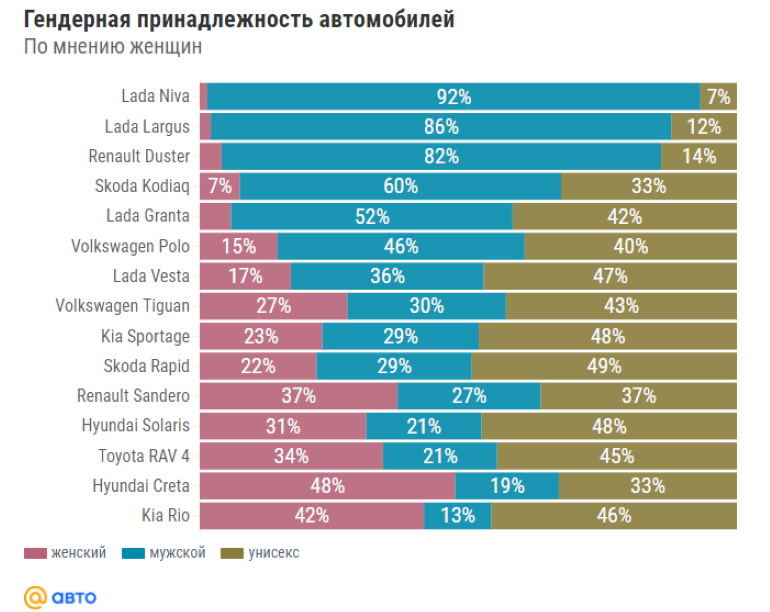 - Lada Largus (86% мужской, 12% унисекс, 2% женский)