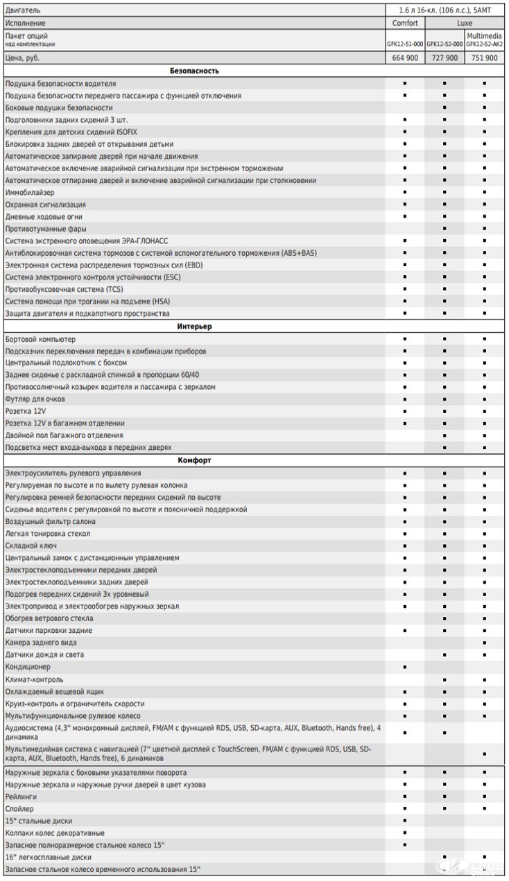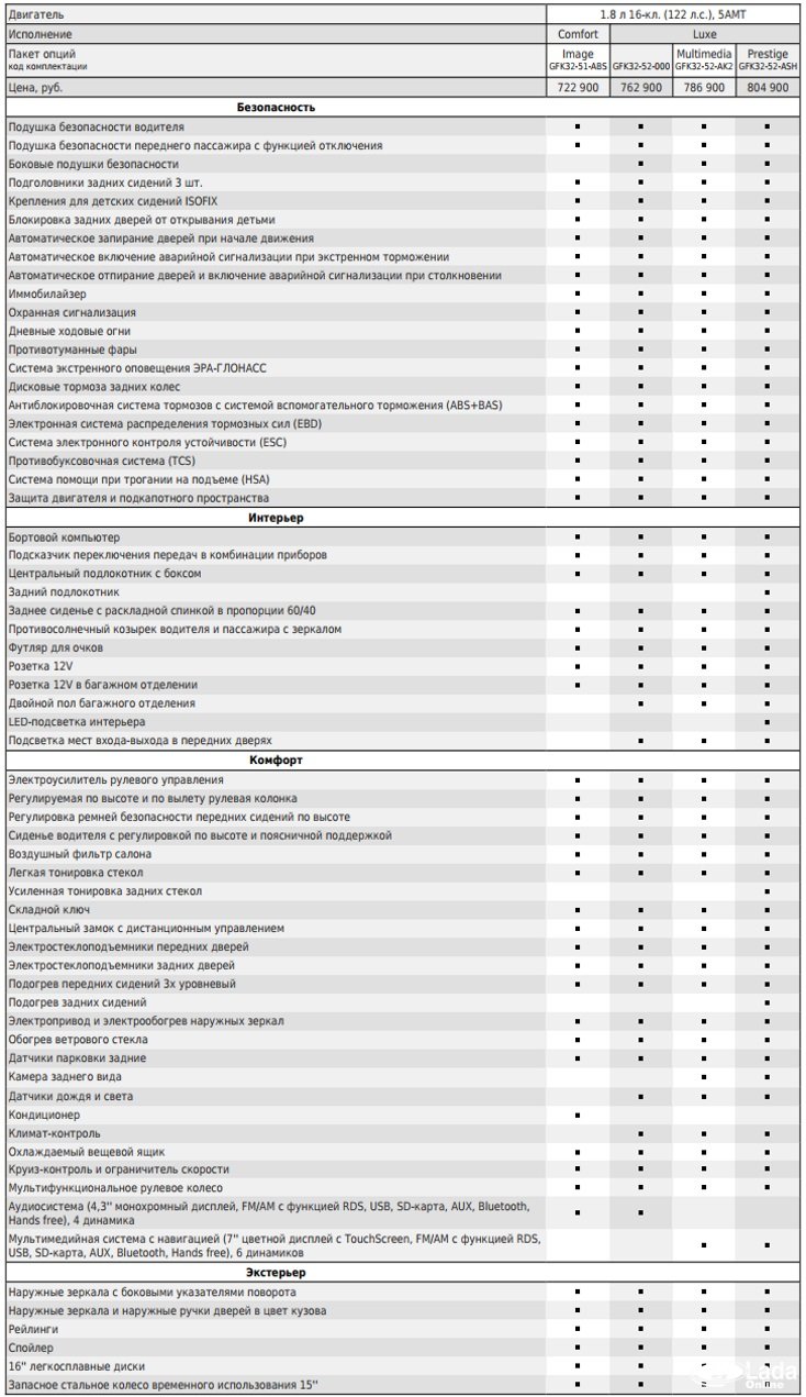 Внимание! Стоит отметить, что в таблицах представлено оснащение автомобиля на момент выхода новинки. АВТОВАЗ постоянно меняет комплектации своих автомобилей, актуальную информацию вы найдете на официальном сайте в удобном формате PDF.