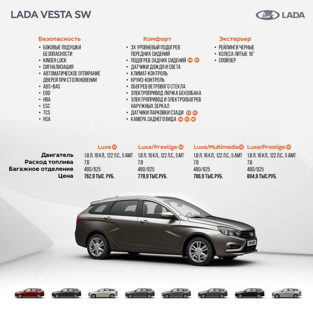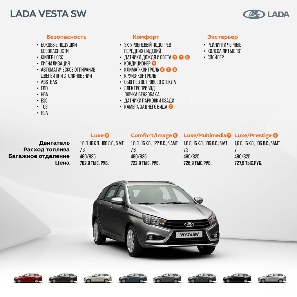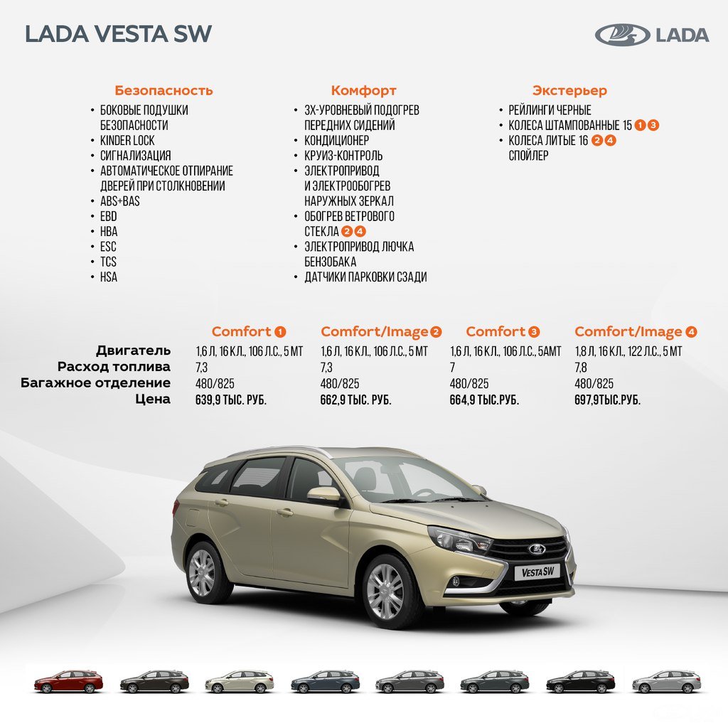 19 сентября на официальном сайте LADA появилась информация о стоимости Lada Vesta SW (универсал). Вместе с этим на ресурсе опубликовали таблицу оснащения этого автомобиля. Среди 16-ти комплектаций LADA Vеsta SW, каждый найдет себе автомобиль по душе!