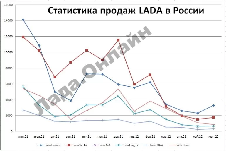 Ассоциация европейского бизнеса (АЕБ) опубликовала результаты продаж автомобилей в РФ за июнь 2022 года. В прошлом месяце в России было продано 27 761 легковых автомобилей (LADA - 7 484 шт.), что на 82% меньше (LADA - -81%), чем в июне 2021 года. Лидером продаж стала Lada Granta. Дно продаж новых автомобилей в РФ было зафиксировано месяцем ранее (-83,5%).