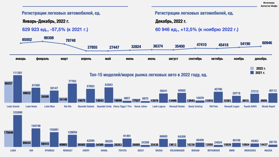 «Автостат Инфо» обнародовал данные по продажам легковых автомобилей в России в 2022 году. Новое исследование показывает, что за весь прошлый год в стране было продано 629 923 новых легковушки. Это на 57,5% меньше, чем было реализовано за весь 2021 год — 1 483 444 авто.