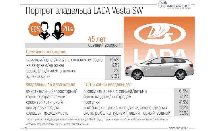 Более подробно аналитики рассказали про владельцев Lada Vesta SW. Соотношение мужчин и женщин 80% к 20%, а средний возраст - 45 лет. В 81,4% случаев это замужние/женатые люди.