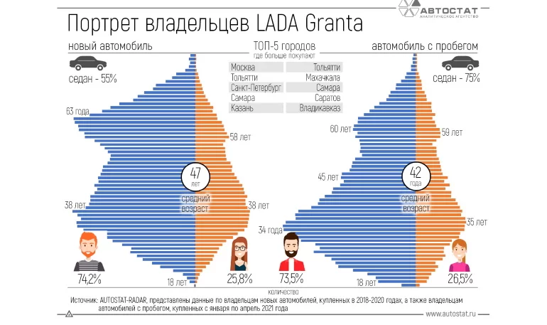 У владельцев Lada Granta средний возраст 47 лет, подержанной - немного ниже (42 года). Из тех, кто покупает «гранты», мужчины составляют абсолютное большинство (свыше 70%), причем как по новым, так и по подержанным автомобилям.
