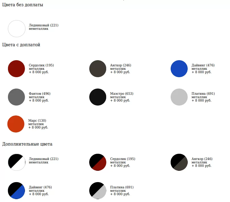 Цветовая гамма Lada Vesta первого поколения состояла из восьми цветов. Доплата за металлик составляла 8000 рублей.