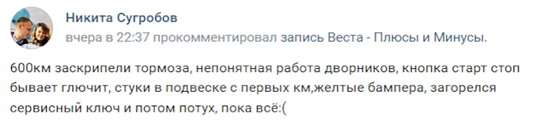 Некоторые владельцы Vesta NG, которые успели проехать более 10 тыс.км., отмечают, что передние колодки требуют замены. Проблема в том, что в дилерских центрах не могут заменить передние тормозные колодки, т.к. их еще не отгружает Лада Имидж (официальным дистрибьютор АВТОВАЗа по реализации запасных частей к автомобилям LADA). Неизвестен даже артикул этих расходников.