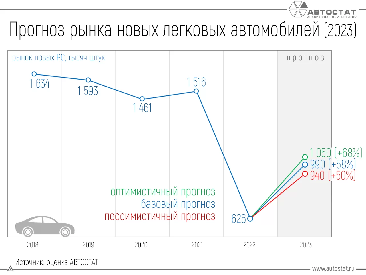 Еще месяц назад базовый прогноз экспертов агентства на текущий год составлял 930 тыс. единиц. Сейчас этот показатель увеличен до 990 тыс. экземпляров (+58% к результату 2022 года). При оптимистичном сценария продажи новых машин в России могут составить 1 млн 050 тыс. единиц (+68%). Даже в пессимистичном прогнозе агентства продажи новых легковых автомобилей вырастут на 50% и составят 940 тыс. штук.